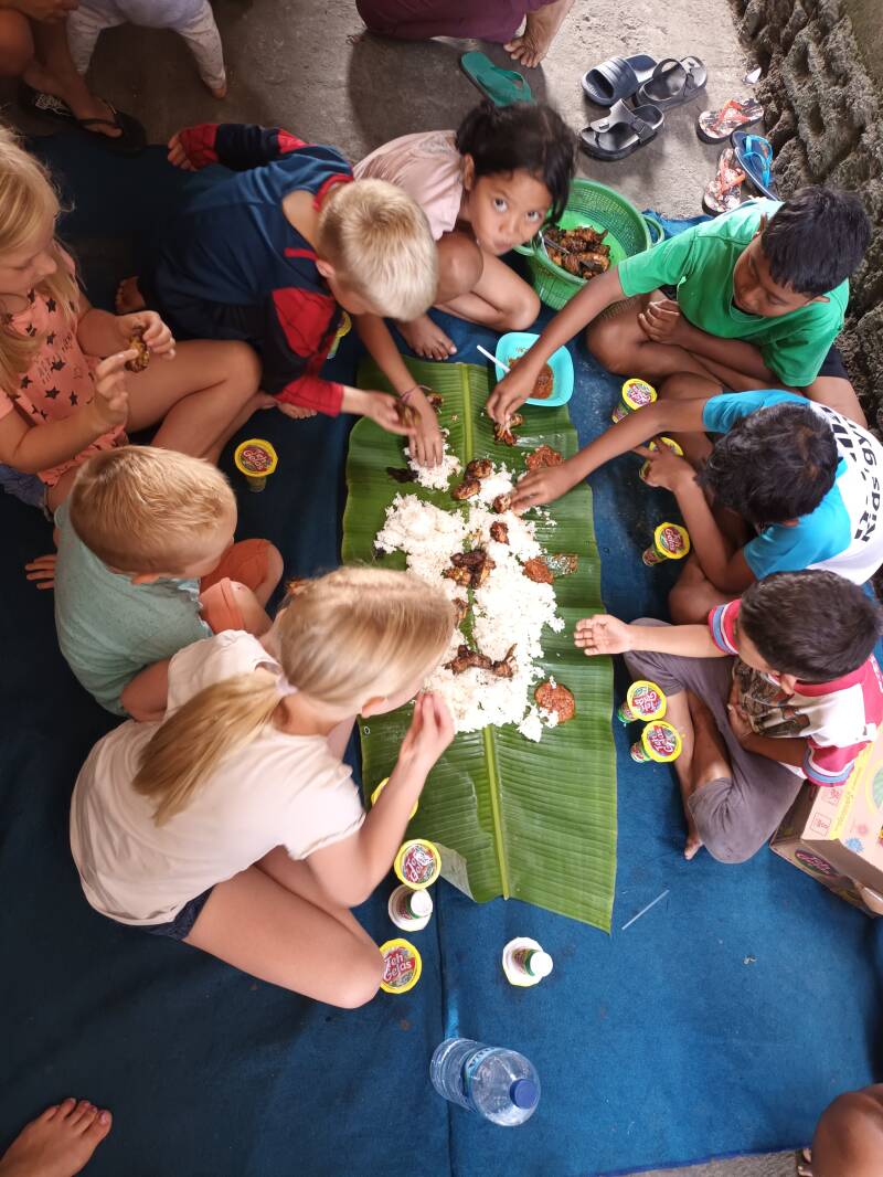 Er is al rijst gekookt door een moeder en een andere moeder staat de sambal te koken. Het bananenblad wordt op de grond gelegd en iedereen gaat er omheen zitten. De rijst wordt uitgespreid op het blad en de kip daar weer bovenop. De sambal wordt ook her en der op het blad gelegd, iets waar onze kids zich nog niet aan durven te wagen. Een bakje met water gaat rond, waar iedereen zn handen in kan wassen. En dan kan de maaltijd beginnen. Ik leg onze kids uit dat ze met hun rechterhand mogen eten en dat ze maar goed naar hun vriendjes moeten kijken hoe zij dat doen.